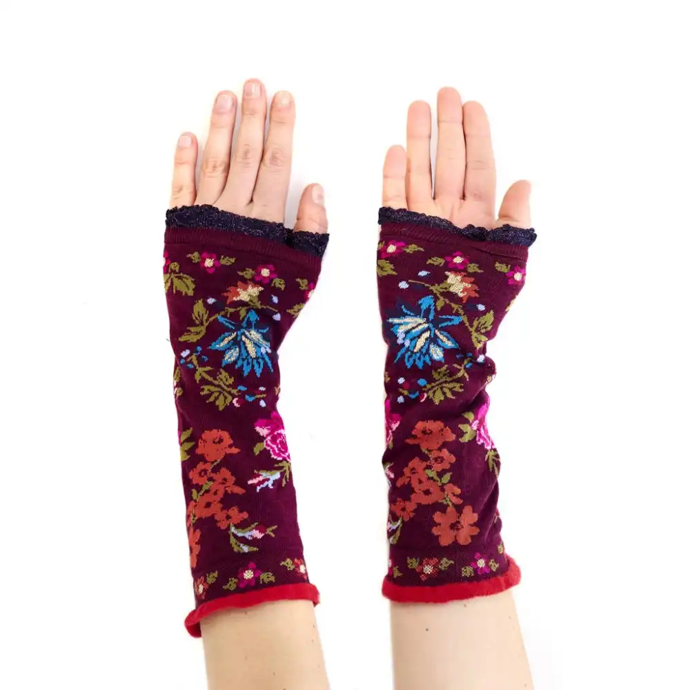 Τα γάντια Bloom της Fil de Jour είναι μπορντό και διακοσμημένα με λουλούδια σε μπλε, πορτοκαλί και κίτρινο, προσθέτοντας μια ζωηρή και χαρούμενη πινελιά στο στυλ σας. Το rib τελείωμα από κόκκινο νήμα chenille εξασφαλίζει άνεση και απαλή υφή όλη την ημέρα.