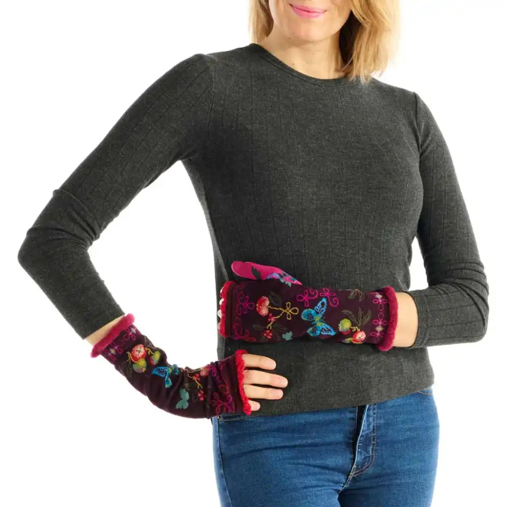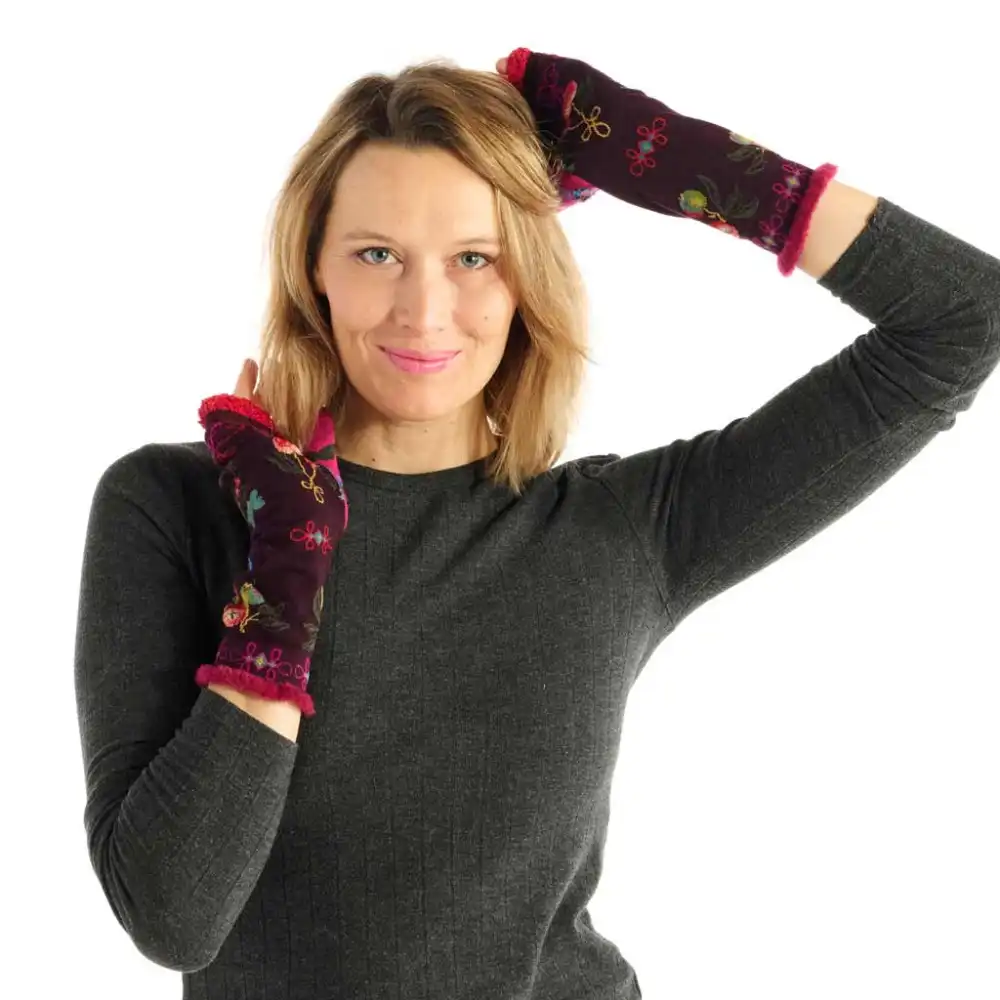 Τα γάντια με αντίχειρα ξεχωρίζουν για τη γαλλική τους κατασκευή, εγγύηση ποιότητας και στήριξης της τοπικής παραγωγής. Ο κομψός τους σχεδιασμός με πολύχρωμα κεντημένα λουλουδάτα μοτίβα και κόκκινες κυματιστές άκρες προσθέτει μια πινελιά θηλυκότητας και εκλεπτυσμένου στυλ. Το βαθύ δαμασκηνί χρώμα τις καθιστά ιδανικές για τις εμφανίσεις του φθινοπώρου και του χειμώνα. Παράλληλα, προσφέρουν άνεση και πρακτικότητα, επιτρέποντας μεγάλη ελευθερία κινήσεων ενώ διατηρούν τα χέρια ζεστά και άνετα όλη την ημέρα. Ιδανικές για καθημερινή χρήση με στυλ.