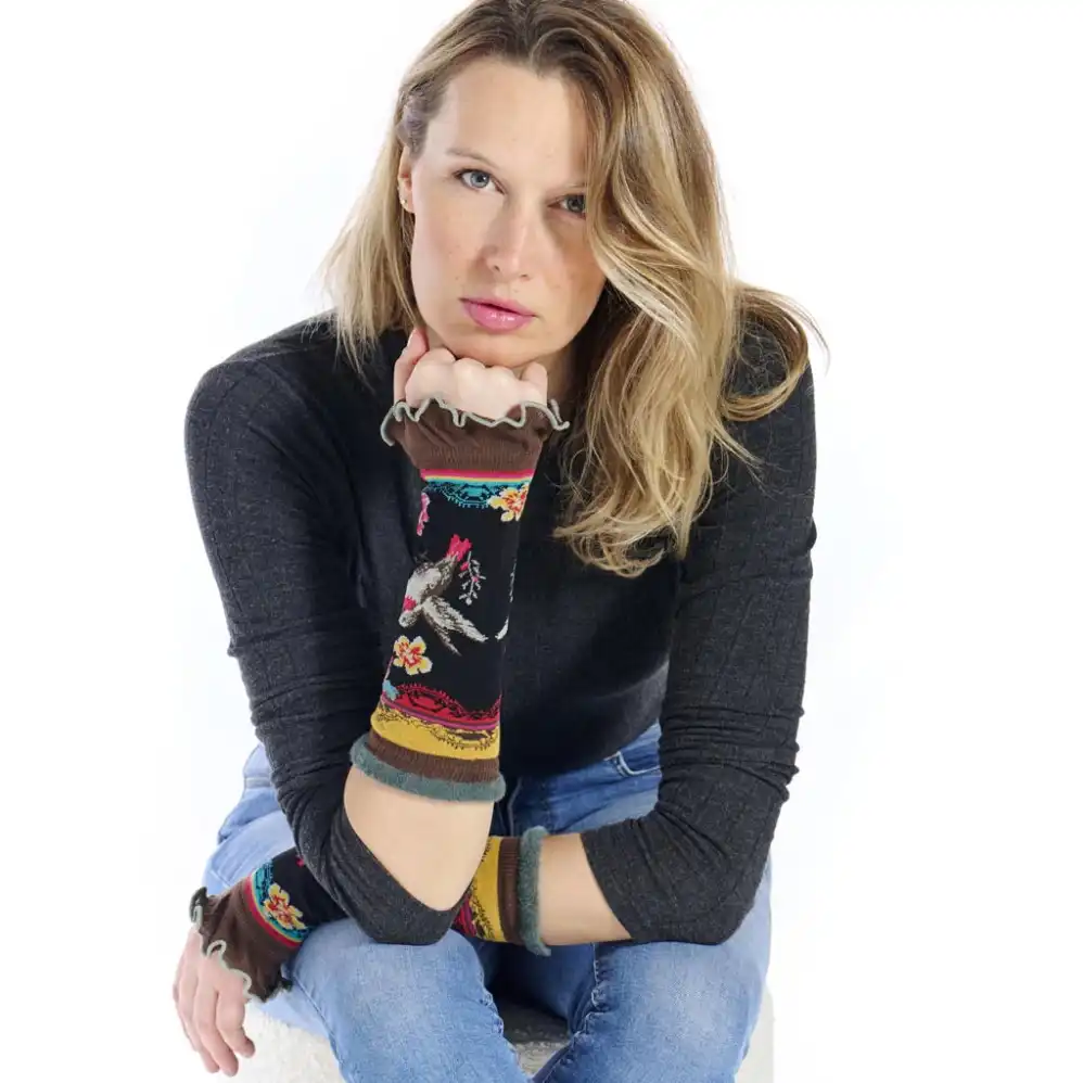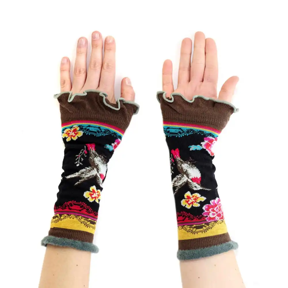 Γυναικεία γάντια Nectar από την Dub & Drino. Κατασκευασμένα στην Ιταλία, με υψηλή περιεκτικότητα σε βαμβάκι για ευχάριστη και απαλή αίσθηση στην αφή. Το λάστιχο στην πλευρά της παλάμης είναι γαζωμένο, προσφέροντας κομψό και προσεγμένο τελείωμα, ενώ το λάστιχο στην πλευρά του αγκώνα είναι από νήμα σενίλ για εξαιρετικά απαλό αποτέλεσμα. Μαύρο φόντο διακοσμημένο με κίτρινα και ροζ λουλούδια, που συμπληρώνονται αρμονικά από ένα κομψό μοτίβο κολιμπρί.