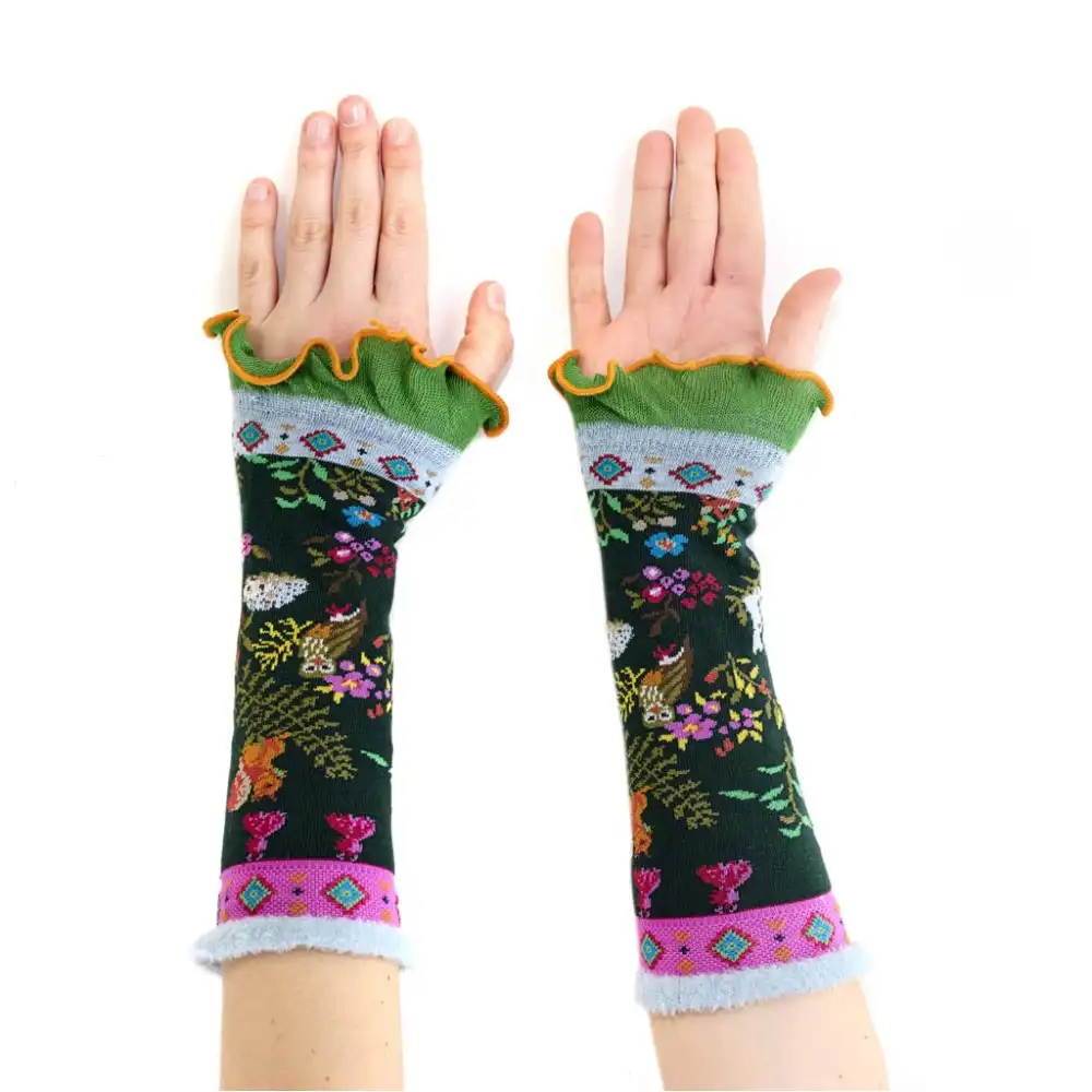 Γυναικεία γάντια Silva από την Dub & Drino. Κατασκευασμένα στην Ιταλία, με υψηλή περιεκτικότητα σε βαμβάκι για άνεση και απαλή αίσθηση στο δέρμα. Το πλεκτό λάστιχο στην πλευρά της παλάμης είναι γαζωμένο για κομψό τελείωμα, ενώ το πλεκτό λάστιχο στην πλευρά του αγκώνα είναι από νήμα σενίλ για μία cozy και chic λεπτομέρεια. Κυρίως σε αποχρώσεις του πράσινου, με ροζ ρίγα λίγο πριν από το τελείωμα του αγκώνα. Ένα σχέδιο εμπνευσμένο από τη φύση που συνδυάζει τα ζώα και τα φυτά του δάσος. Προσθέστε μία πινελιά κομψότητας στο καθημερινό σας look.