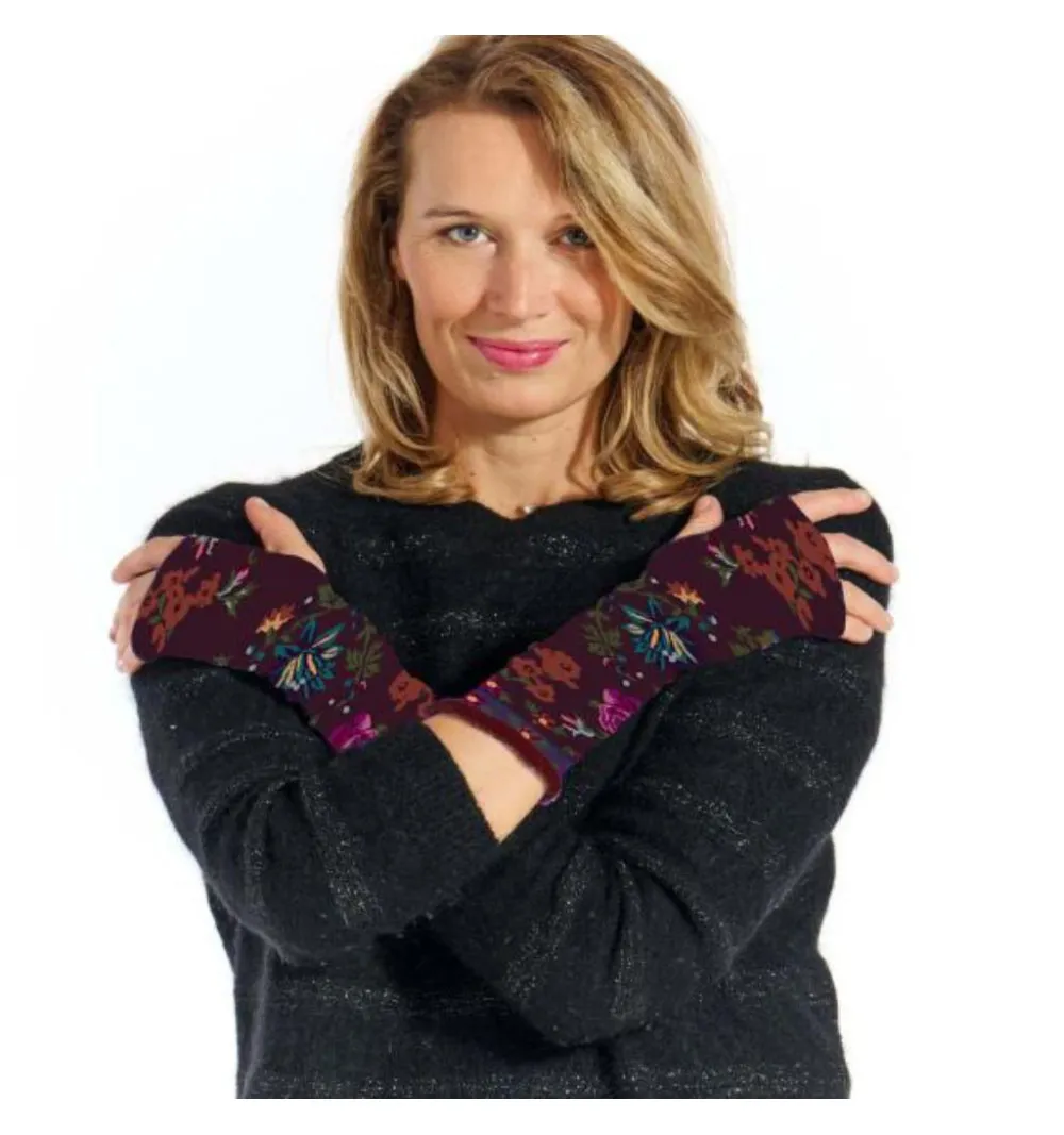 Οι μιτίνες Bloom της Fil de Jour είναι μωβ με άνοιγμα για τον αντίχειρα, διακοσμημένες με λουλουδάτα μοτίβα σε πορτοκαλί, μωβ και μπλε αποχρώσεις. Το rib τελείωμα από απαλό νήμα chenille προσφέρει άνεση και απαλή υφή, ιδανικό για ζεστά και στιλάτα χέρια.