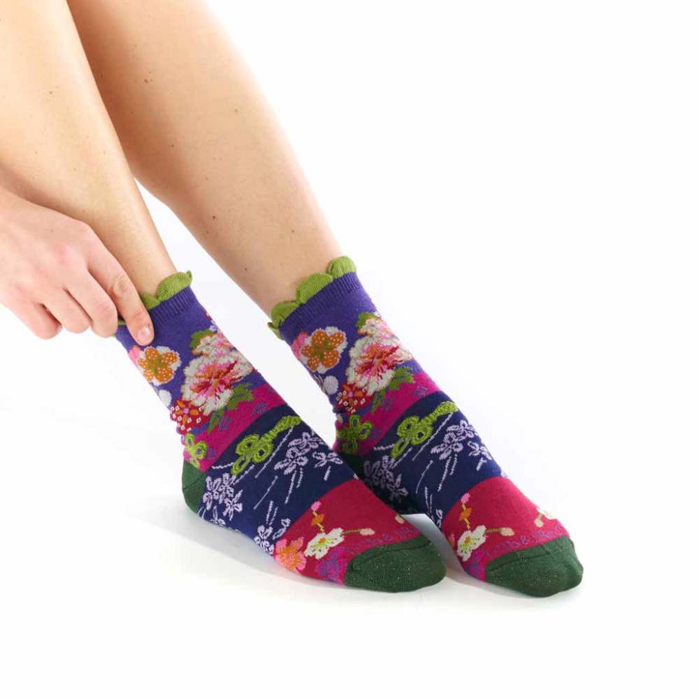 Οι κοντές κάλτσες Shochikubai της Dub & Drino ξεχωρίζουν για τα έντονα floral μοτίβα σε ροζ, πορτοκαλί και λευκές αποχρώσεις πάνω σε βαθύ μωβ φόντο, με πινελιές πράσινου, κόκκινου και μπλε που χαρίζουν ζωντάνια και χαρακτήρα. Το κυματιστό πράσινο τελείωμα προσθέτει μια παιχνιδιάρικη και κομψή λεπτομέρεια. Κατασκευασμένες στην Ιταλία, προσφέρουν εξαιρετική άνεση χάρη στη σύνθεση με υψηλή περιεκτικότητα σε βαμβάκι, ενώ η ελαστικότητα και η ανθεκτικότητα τις καθιστούν ιδανικές για καθημερινή χρήση. Ιδανικές για όσους αγαπούν το τολμηρό στυλ και τις ξεχωριστές λεπτομέρειες.