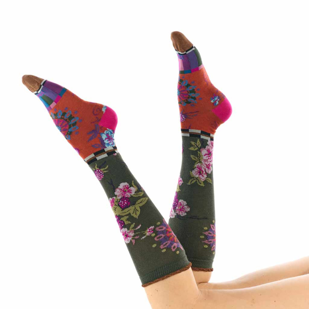 Δώστε ζωντάνια και χρώμα στα πόδια σας με τις ψηλές κάλτσες Rubus από την εταιρία Dub & Drino. Κατασκευασμένες στην Ιταλία, με μοτίβα από μούρα και λουλούδια σε αποχρώσεις ροζ και μωβ πάνω σε χαλαρωτικό χακί φόντο. Οι πινελιές πράσινου, πορτοκαλί και καφέ δημιουργούν ένα ζωηρό και αρμονικό αποτέλεσμα, ενώ οι κυματιστές λεπτομέρειες προσθέτουν κομψότητα και φινέτσα. Η κυρίαρχη σύνθεση από βαμβάκι εξασφαλίζει απαλότητα και διαπνοή, ενώ το μείγμα νάιλον, βισκόζης, πολυεστέρα και ελαστάνης προσφέρει ελαστικότητα και ανθεκτικότητα για καθημερινή άνεση.
