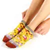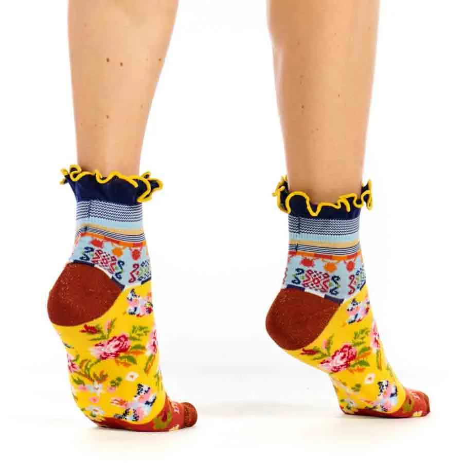 Οι κοντές κάλτσες Birdy από την Dub & Drino φέρνουν φρεσκάδα και χαρά στην καθημερινότητά σας. Σε έντονο κίτρινο χρώμα, διακοσμούνται με πολύχρωμα μοτίβα πουλιών και λουλουδιών, με μαύρα τακούνια και μύτες, δημιουργώντας ένα δυναμικό και παιχνιδιάρικο αποτέλεσμα.