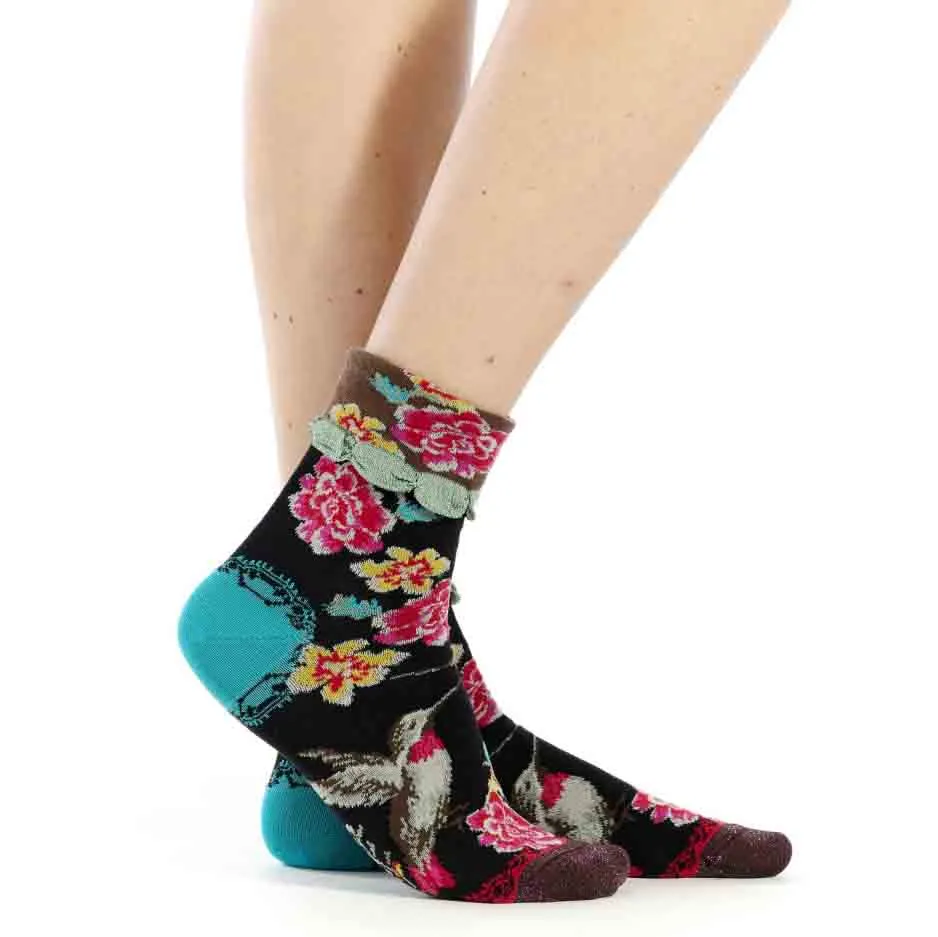 Οι γυναικείες κάλτσες με ρεβέρ Nectar της Dub & Drino είναι μαύρες με ροζ και κίτρινα λουλούδια και μοτίβα κολιμπρί. Η μύτη είναι μωβ με διακριτικές παγιέτες και η φτέρνα σε κυανή απόχρωση. Το ρεβέρ είναι καφέ με τελείωμα από νήμα chenille σε πράσινο του νερού, προσφέροντας απαλή υφή και ξεχωριστό στυλ.