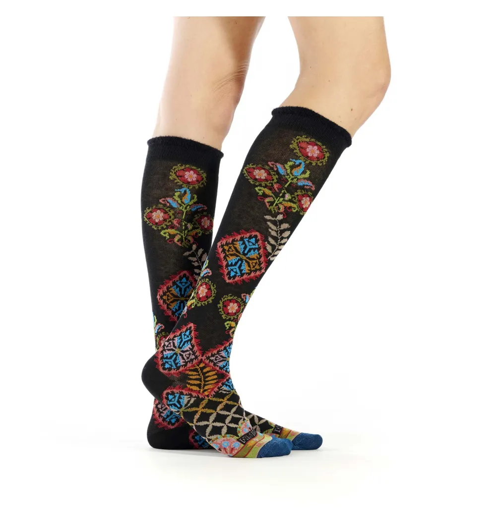 Μαύρα mi-bas με λουλουδάτα, γεωμετρικά και φυτικά μοτίβα, μήκους έως κάτω από το γόνατο. Κομψή και ιδιαίτερη επιλογή για καθημερινό στυλ με χαρακτήρα.