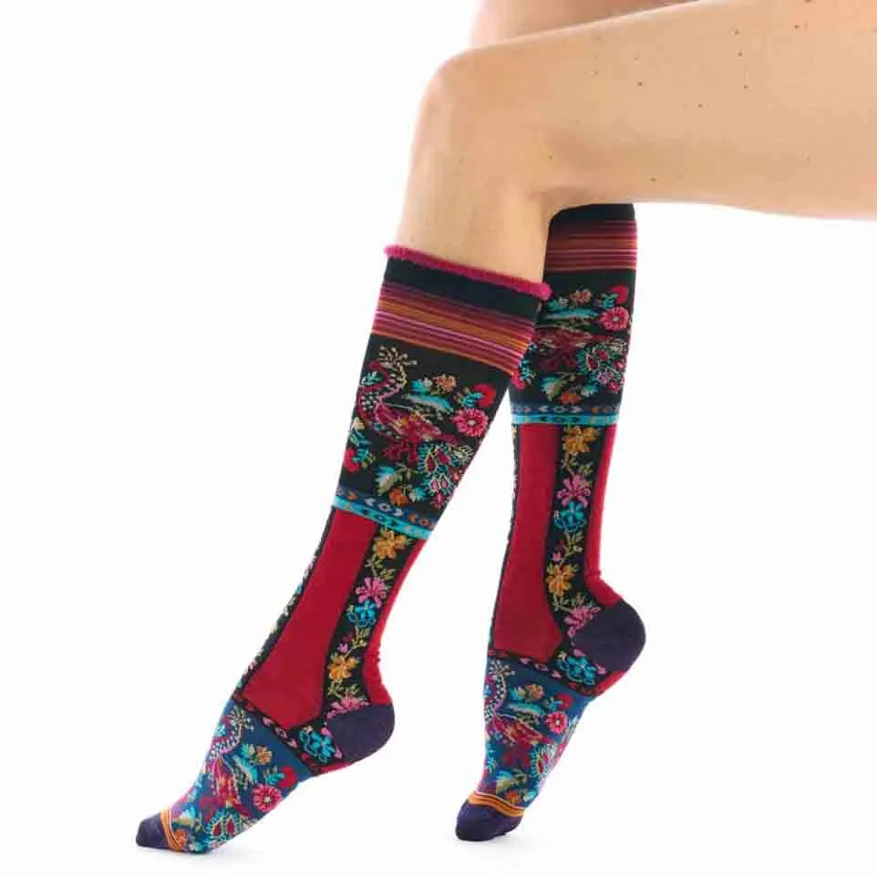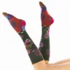 Ζωηρή ψηλή κάλτσα με εντυπωσιακά λουλουδάτα σχέδια σε αποχρώσεις μπλε, κόκκινου, κίτρινου και πράσινου πάνω σε μαύρο και κόκκινο φόντο από την εταιρία Dub & Drino. Κατασκευασμένη στην Ιταλία από μαλακό βαμβάκι, προσφέρει άνεση, ελαστικότητα και τέλεια εφαρμογή. Ιδανική για να δώσετε χρώμα και φαντασία σε κάθε εμφάνιση.