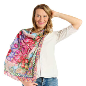 Αυτό το γυναικείο φουλάρι σε μέγεθος 70×70 εκ. αποτελεί ένα αληθινό έργο τέχνης από μοτίβα και χρώματα που συνδυάζονται αρμονικά. Στο κέντρο, ένα σύνολο γεωμετρικών σχημάτων σε αποχρώσεις μοβ, ροζ, μπλε και κόκκινο σχηματίζει μια ζωντανή καρδιά συμμετρίας και βάθους. Το κεντρικό μοτίβο περιβάλλεται από μπουκέτα κόκκινων, ροζ και πορτοκαλί τριαντάφυλλων, τοποθετημένα ισορροπημένα για να πλαισιώσουν το σχέδιο και να προσφέρουν μια δόση φρεσκάδας και λουλουδένιας γοητείας. Οι γωνίες του φουλαριού αποκαλύπτουν λεπτομερή μοτίβα κασμίρ, όπου οι αποχρώσεις τιρκουάζ, κόκκινο και πράσινο αναμιγνύονται με λεπτότητα. Τα μοτίβα αυτά συνοδεύονται από μικρά, πολύχρωμα λουλούδια που θυμίζουν τα στολίδια των παραδοσιακών υφασμάτων, προσδίδοντας πλούσιο οπτικό αποτέλεσμα. Μια λωρίδα από πράσινα και λευκά τετράγωνα περιβάλλει τα κεντρικά αυτά στοιχεία, προσθέτοντας σαφή δομή και γραφικό αντίθετο στην σύνθεση. Η εξωτερική μπορντούρα φέρει γεωμετρικό μοτίβο ikat σε αποχρώσεις κόκκινου, μπλε και κίτρινου, που παραπέμπει στην παραδοσιακή τεχνική και ενισχύει τον μοναδικό χαρακτήρα του φουλαριού. Κάθε λεπτομέρεια αυτής της μπορντούρας έχει σχεδιαστεί για να δημιουργεί ένα τολμηρό και καθοριστικό φινίρισμα, ιδανικό για να πλαισιώσει τα λουλουδένια και γεωμετρικά στοιχεία στο κέντρο. Κατασκευασμένο από ελαφρύ πολυεστέρα, το φουλάρι είναι απαλό και ρέον, ευχάριστο στη χρήση σε κάθε περίσταση. Μπορεί να φορεθεί γύρω από τον λαιμό για κομψό αποτέλεσμα, ως στέκα στα μαλλιά ή δεμένο σε μια τσάντα για να προσθέσει προσωπικό στυλ.
