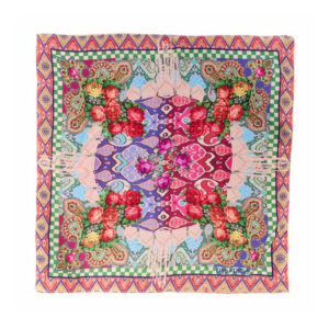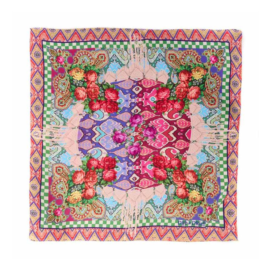 Γυναικείο φουλάρι της εταιρίας Dub & Drino. Ένα ξεχωριστό αξεσουάρ που αναβαθμίζει κάθε εμφάνιση, με πλούσια μοτίβα που συνδυάζουν πολύχρωμο γεωμετρικό κέντρο, μπουκέτα τριαντάφυλλων και λεπτομέρειες κασμίρ στις γωνίες. Η μπορντούρα ikat προσθέτει μια κομψή αντίθεση και ενισχύει τον μοναδικό χαρακτήρα του φουλαριού. Ελαφρύ και απαλό στην αφή, φοριέται εύκολα γύρω από τον λαιμό, στα μαλλιά ή δεμένο σε τσάντα, προσθέτοντας άμεσα χρώμα και στυλ σε κάθε εμφάνιση.