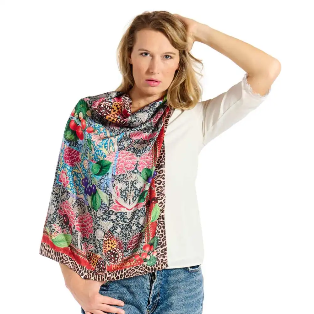 Γυναικείο φουλάρι της εταιρίας Dub & Drino. Ένα ξεχωριστό αξεσουάρ με έντονο χαρακτήρα που αναβαθμίζει κάθε εμφάνιση. Διακοσμημένο με πλούσια μοτίβα που συνδυάζουν λουλούδια, φρούτα και πεταλούδες σε ζωηρές αλλά απόλυτα αρμονικές αποχρώσεις, αποπνέει φρεσκάδα και θηλυκότητα. Το λεοπάρ περίγραμμα δημιουργεί μια κομψή αντίθεση, προσθέτοντας fashion ύφος και μια διακριτική δόση δυναμισμού. Ελαφρύ και ευχάριστο στην αφή, φοριέται εύκολα όλες τις εποχές, είτε στον λαιμό, είτε στα μαλλιά ή δεμένο στην τσάντα για ένα stylish twist.