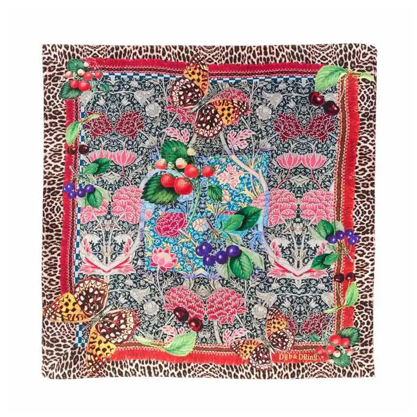 Γυναικείο φουλάρι της εταιρίας Dub & Drino. Ένα κομμάτι με έντονο χαρακτήρα, διακοσμημένο με μοτίβα που συνδυάζουν λουλούδια, φρούτα και πεταλούδες σε ζωηρές και αρμονικές αποχρώσεις. Το λεοπάρ περίγραμμα προσθέτει μια πινελιά αντίθεσης και στυλ.