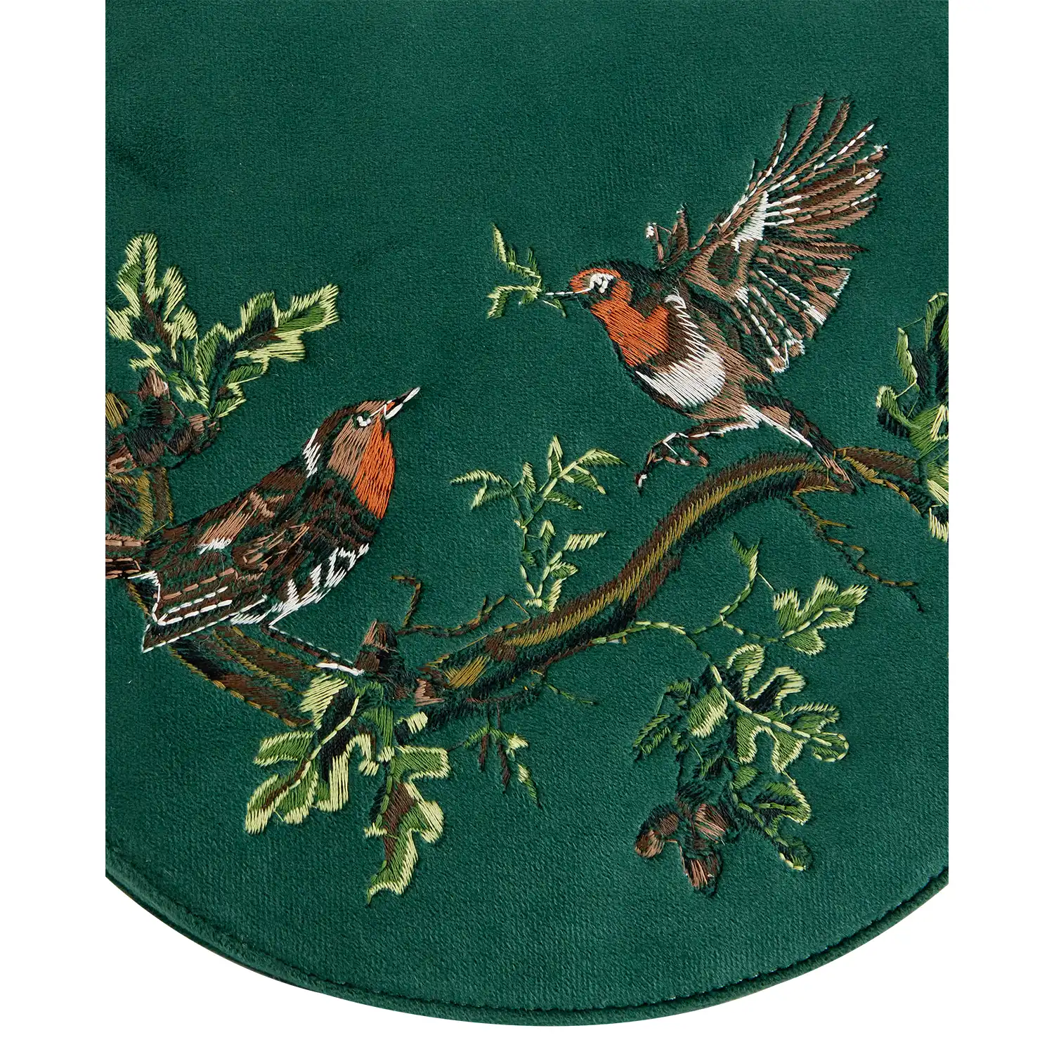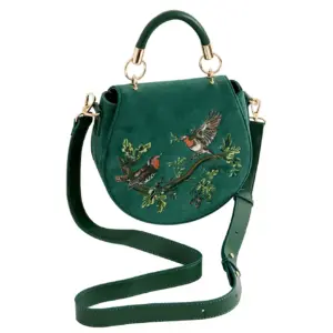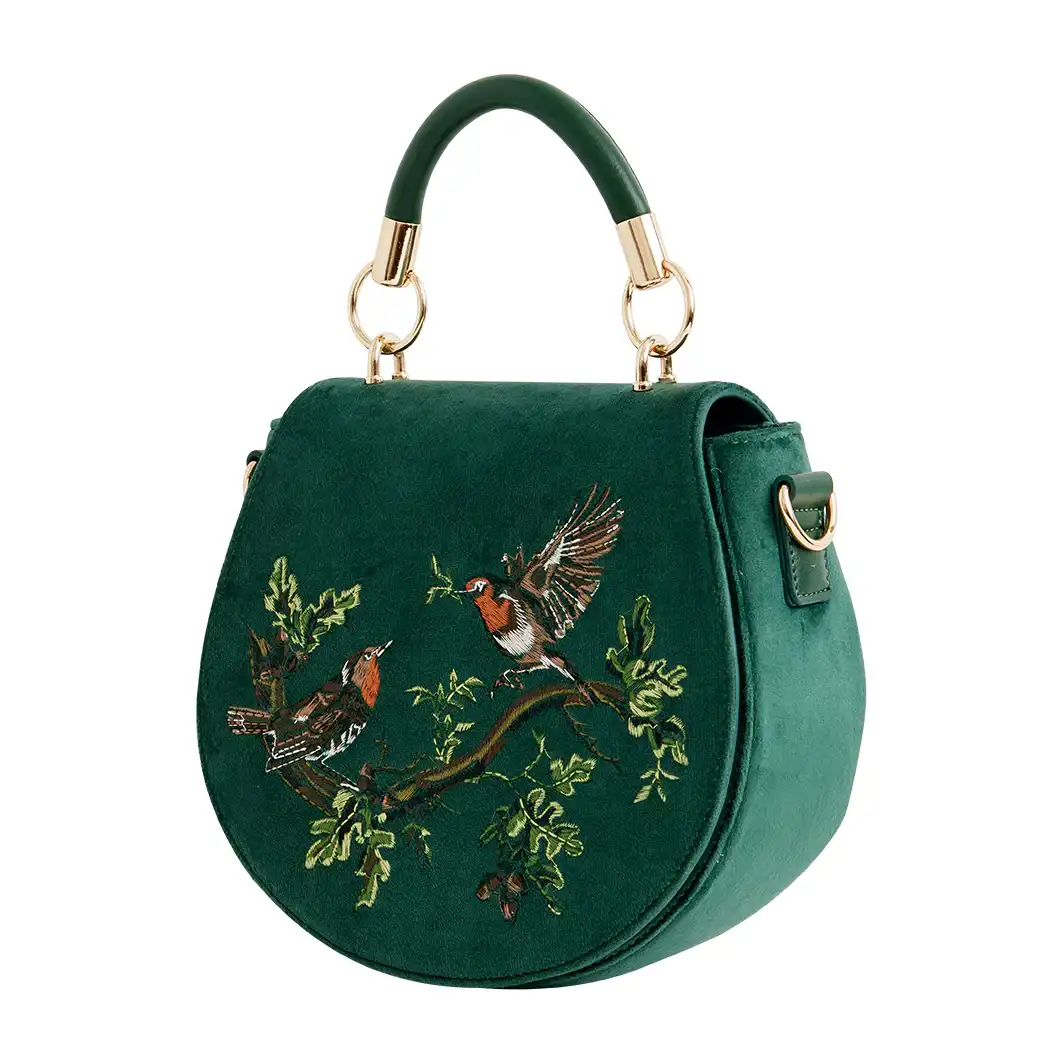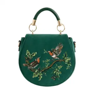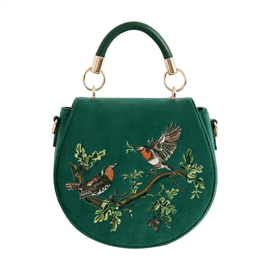 Αφήστε τα χαρούμενα κελαηδήματα των κοκκινολαίμηδων να σας συνοδεύσουν στην επόμενη σας περιπέτεια με την Robin Love Embroidered Saddle Bag. Κατασκευασμένη από πολυτελές βελούδο σε απόχρωση fern green, αυτή η τσάντα διαθέτει στρογγυλεμένη γραμμή τύπου saddle και εντυπωσιακό κέντημα που απεικονίζει δύο αντικριστούς κοκκινολαίμηδες καθισμένους σε κλαδί. Ο κοκκινολαίμης αποτελεί σύμβολο τύχης, ευτυχίας και αναγέννησης. Σχεδιασμένη για να συνδυάζει αισθητική και πρακτικότητα, διαθέτει επάνω χειρολαβή για εύκολη μεταφορά καθώς και ρυθμιζόμενο λουράκι ώμου για άνετη χρήση ως χιαστί τσάντα. Το μαγνητικό κούμπωμα διασφαλίζει ότι τα προσωπικά σας αντικείμενα παραμένουν ασφαλή.