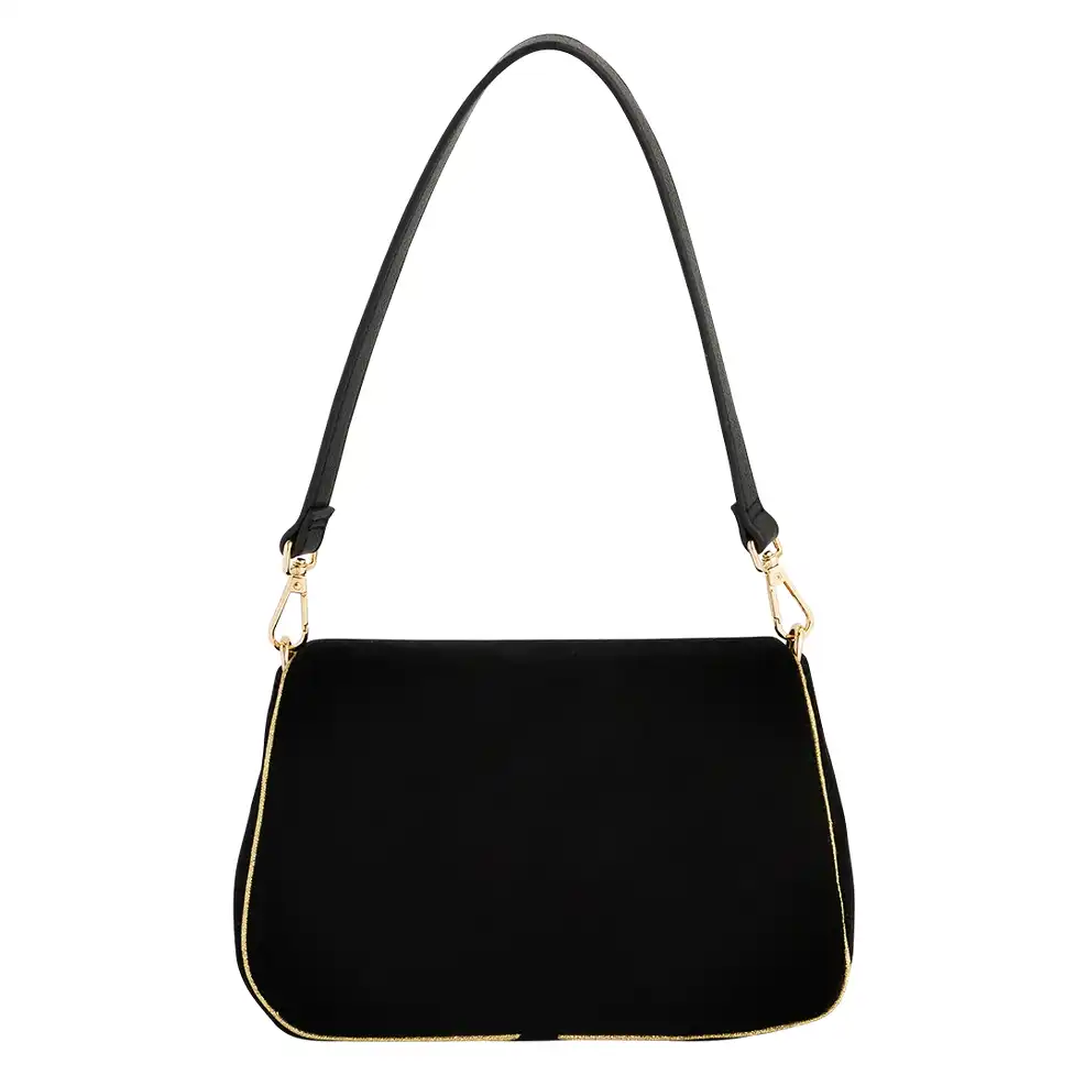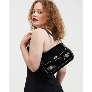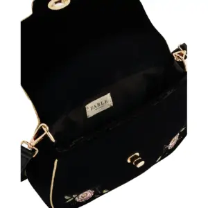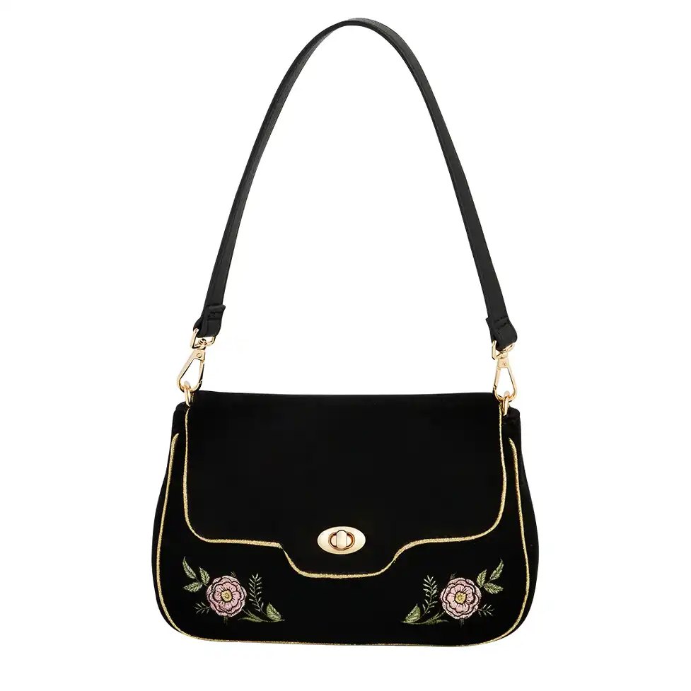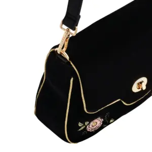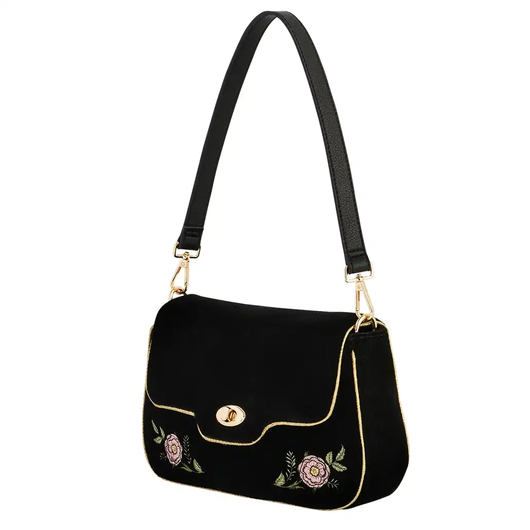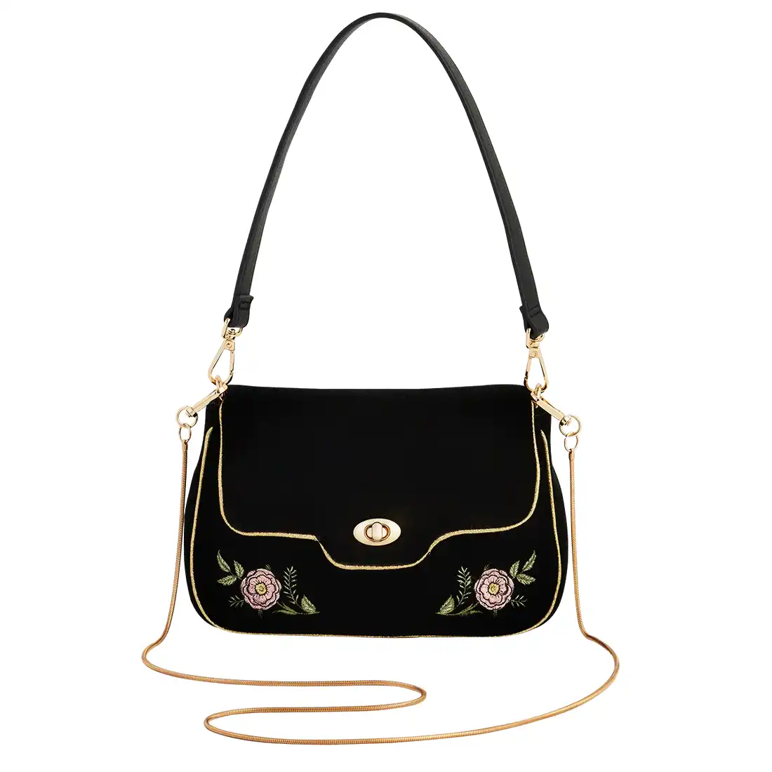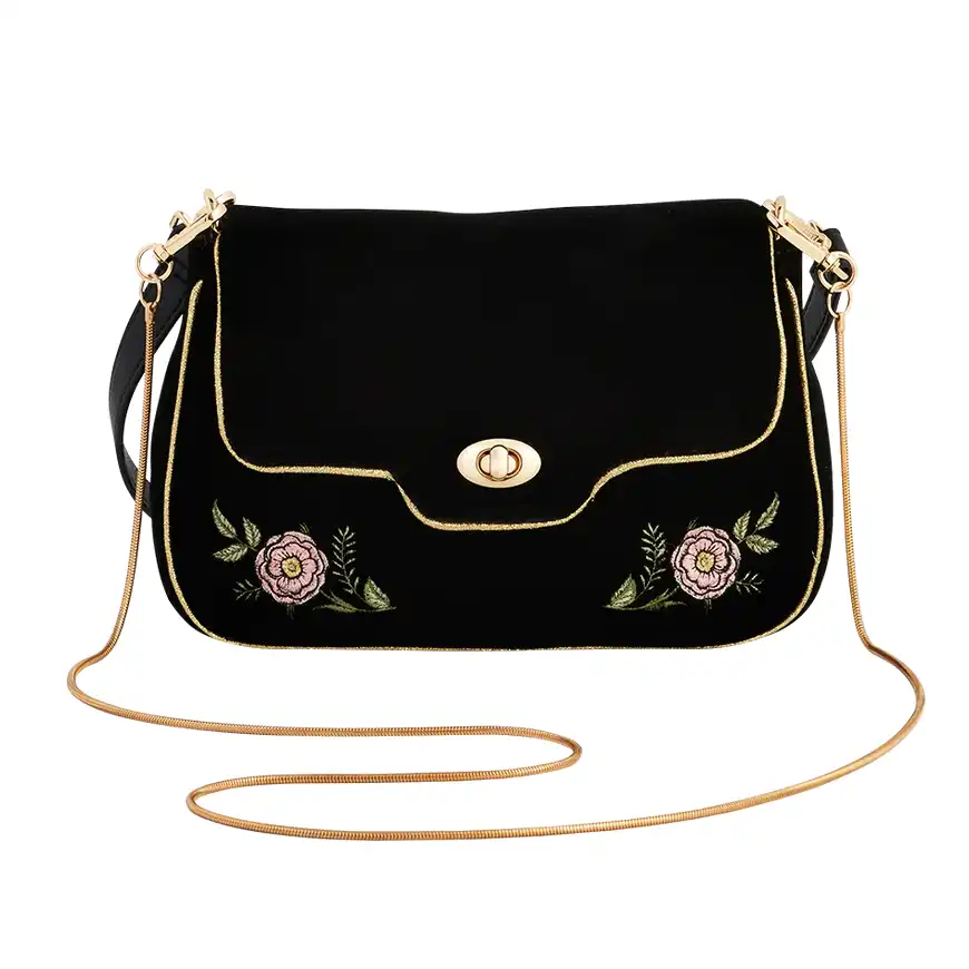 Το Black Rose Velvet Embroidered Clutch προσθέτει μια εκλεπτυσμένη πινελιά στις βραδινές σας εμφανίσεις. Είναι κατασκευασμένο από απαλό μαύρο βελούδο και διακοσμημένο με λεπτεπίλεπτο κέντημα ροζ τριαντάφυλλων. Σε συνδυασμό με το διακριτικό τελείωμα σε χρυσή απόχρωση, χαρίζει ρομαντικές λεπτομέρειες με κομψή, καθαρή γραμμή. Η αποσπώμενη αλυσίδα ώμου επιτρέπει να φορεθεί χιαστί ή να κρατηθεί ως clutch, καθιστώντας το ιδανικό για περιστάσεις όπου η άνεση και η κομψότητα συνυπάρχουν.