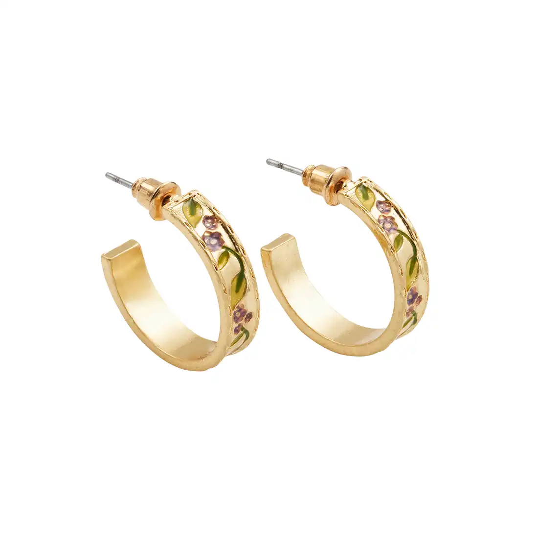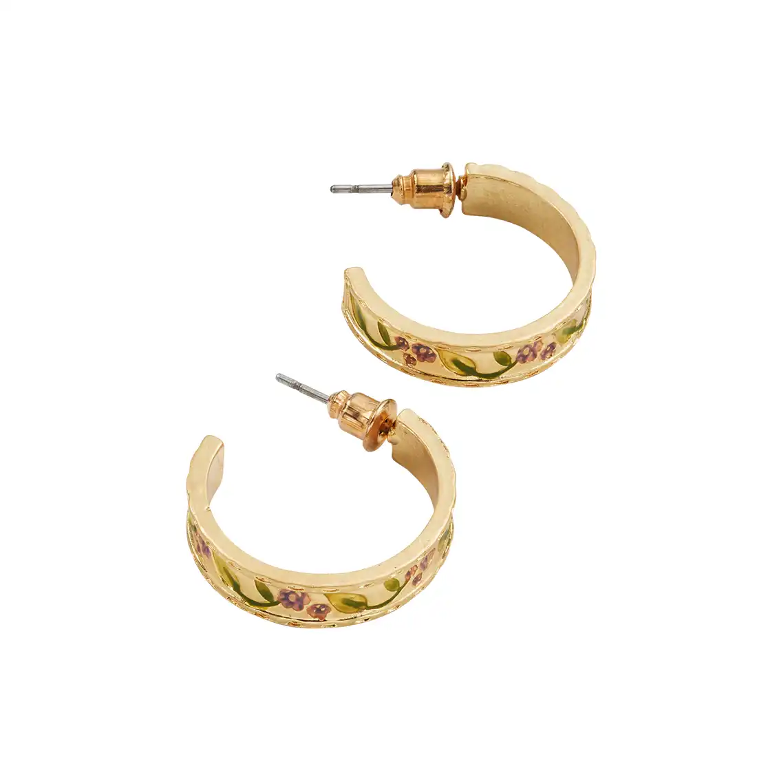 Εμπνευσμένα από τις εικόνες των αγκαθωτών κλημάτων στο σούρουπο, όταν τα κλαδάκια και οι καρποί τους λαμπυρίζουν στο χαμηλό φως, τα Blackberry Bramble Hoop Earrings αποτυπώνουν τη μαγεία της αλλαγής των εποχών. Κατασκευασμένα από ορείχαλκο με επιχρύσωση 22 καρατίων και διακοσμημένα με χειροποίητα ζωγραφισμένα σμάλτινα βατόμουρα που αγκαλιάζουν απαλά κάθε κρίκο, σας μεταφέρουν σε μονοπάτια της φύσης, ανάμεσα σε ρείκια και δασικές διαδρομές.